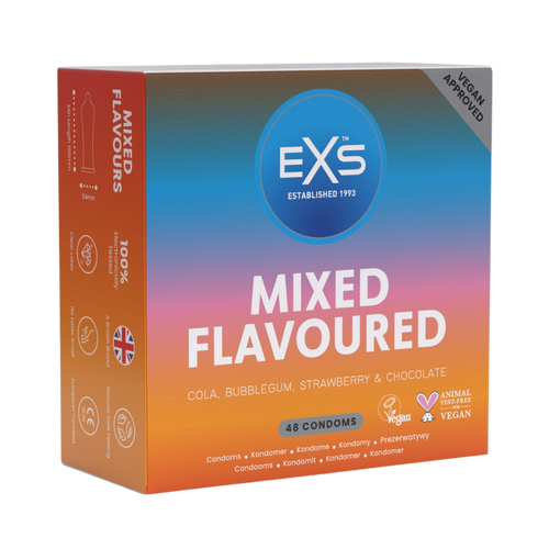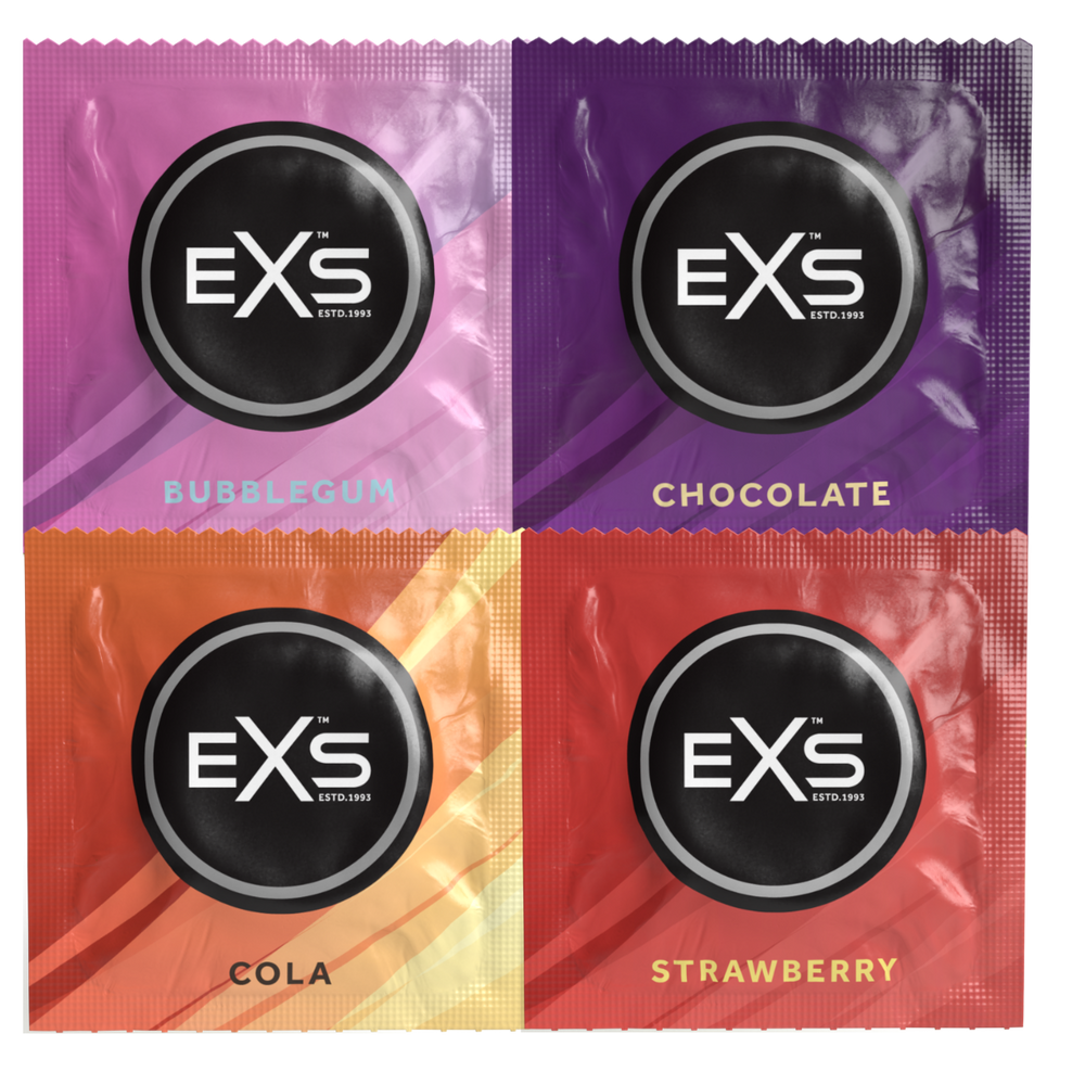 EXS Mixed Flavoured Condoms provide a unique and enjoyable experience with a variety of flavors, including Bubblegum, Chocolate, Strawberry, and Cola. With a width of 54mm and a thickness of 0.073 mm, these condoms offer a secure and comfortable fit for enhanced pleasure. Each condom has a length of 194mm, ensuring full coverage and protection.